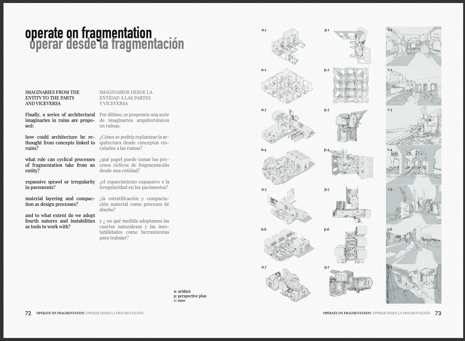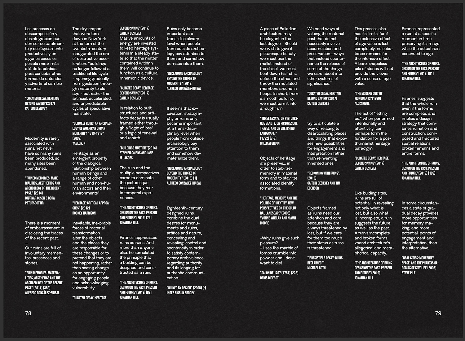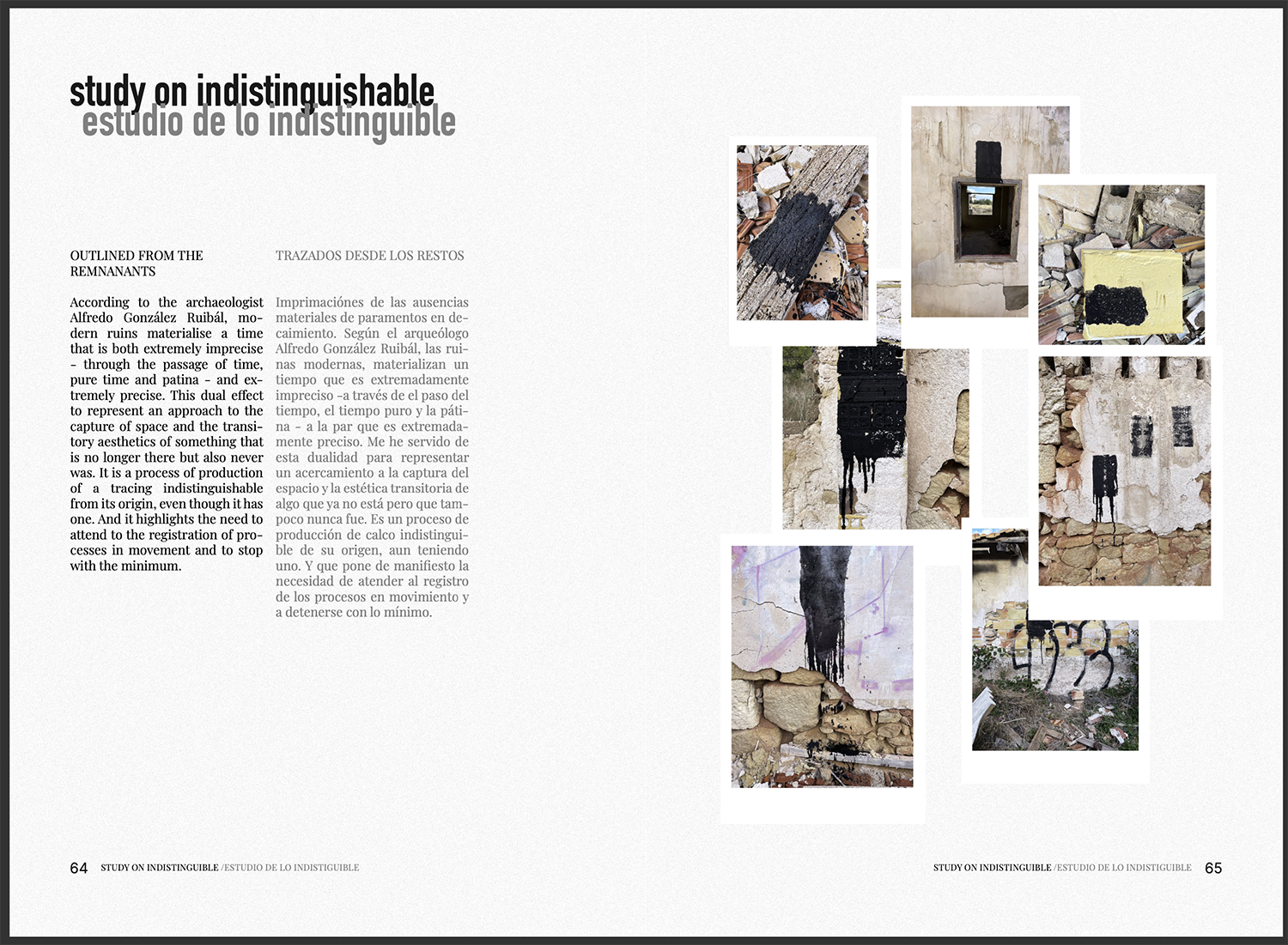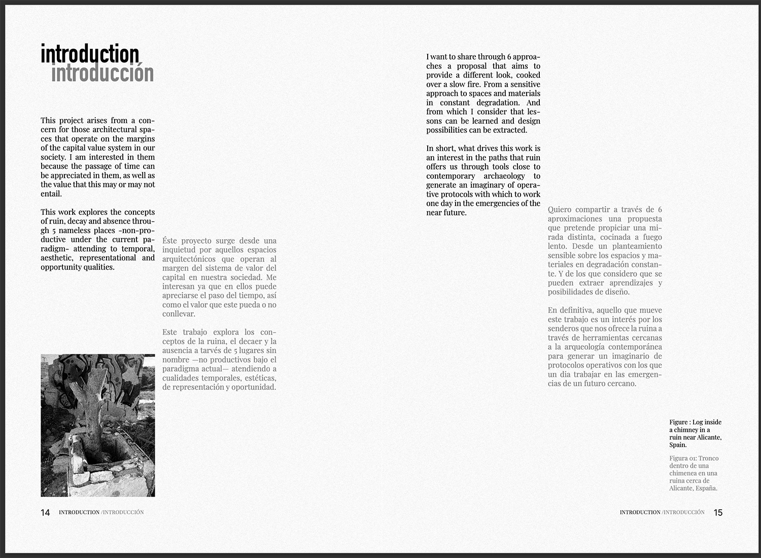 A través de seis enfoques, esta propuesta busca fomentar una mirada distinta, elaborada a fuego lento. Se plantea desde una aproximación sensible a los espacios y materiales en constante degradación, de los cuales considero que pueden extraerse aprendizajes y posibilidades de diseño. Lo que impulsa este trabajo es el interés por los caminos que la ruina nos ofrece, empleando herramientas cercanas a la arqueología contemporánea para generar un imaginario de protocolos operativos con los que, algún día, abordar las urgencias del futuro cercano.