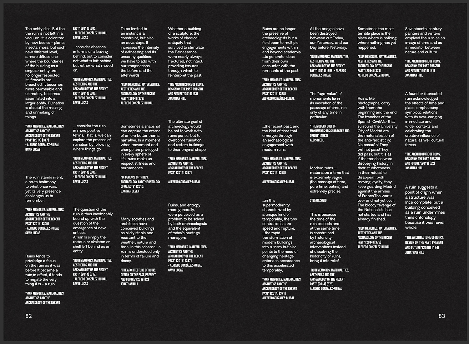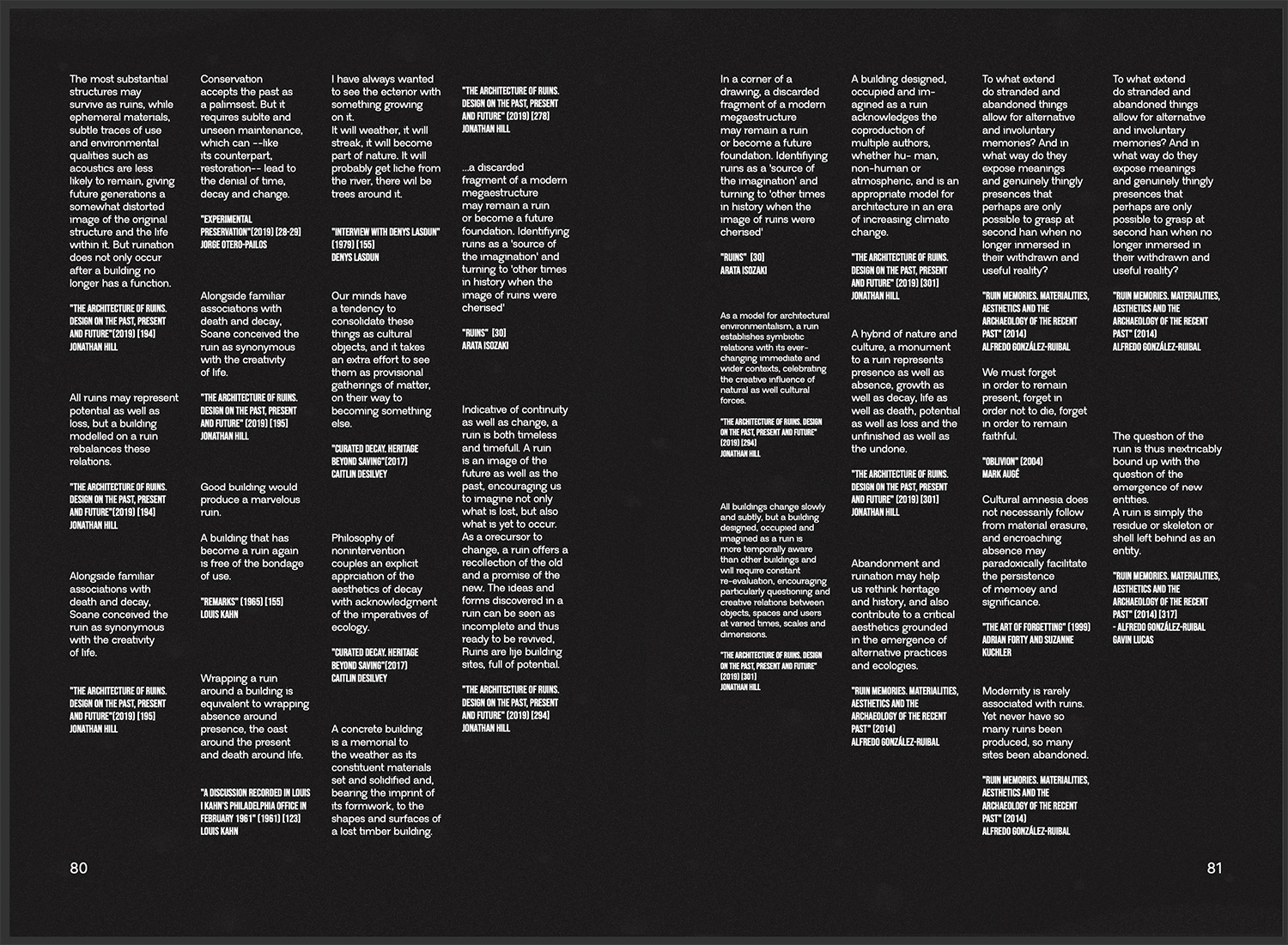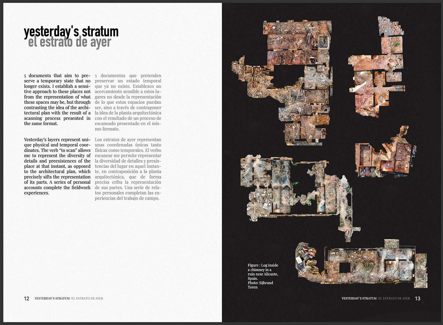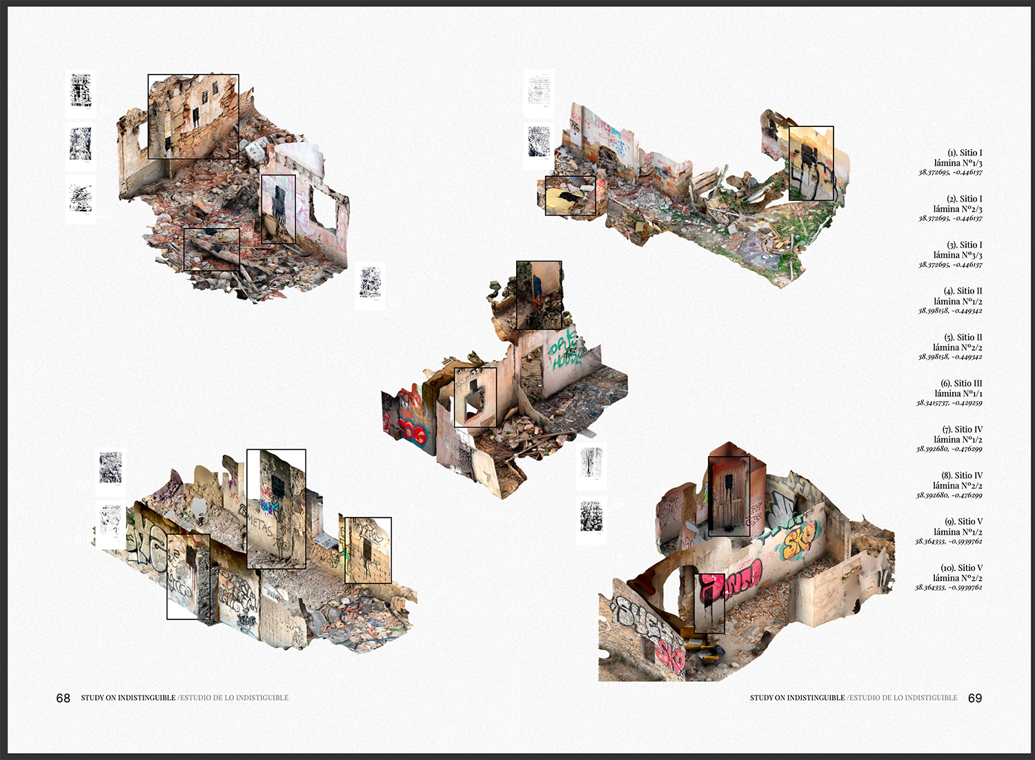 A través de seis enfoques, esta propuesta busca fomentar una mirada distinta, elaborada a fuego lento. Se plantea desde una aproximación sensible a los espacios y materiales en constante degradación, de los cuales considero que pueden extraerse aprendizajes y posibilidades de diseño. Lo que impulsa este trabajo es el interés por los caminos que la ruina nos ofrece, empleando herramientas cercanas a la arqueología contemporánea para generar un imaginario de protocolos operativos con los que, algún día, abordar las urgencias del futuro cercano.